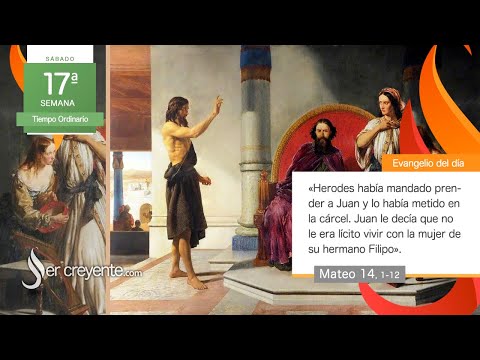 En aquel tiempo se enteró el tetrarca Herodes de la fama de Jesús, y dijo a sus criados: «Ese es Juan el Bautista; él ha resucitado de entre los muertos, y por eso actúan en él fuerzas milagrosas». Es que Herodes había prendido a Juan, le había encadenado y puesto en la cárcel, por causa de Herodías, la mujer de su hermano Filipo. Porque Juan le decía: «No te es lícito tenerla». Y aunque quería matarle, temió a la gente, porque le tenían por profeta. Mas llegado el cumpleaños de Herodes, la hija de Herodías danzó en medio de todos gustando tanto a Herodes, que éste le prometió bajo juramento darle lo que pidiese. Ella, instigada por su madre, «dame aquí, dijo, en una bandeja, la cabeza de Juan el Bautista». Se entristeció el rey, pero, a causa del juramento y de los comensales, ordenó que se le diese, y envió a decapitar a Juan en la cárcel. Su cabeza fue traída en una bandeja y entregada a la muchacha, la cual se la llevó a su madre. Llegando después sus discípulos, recogieron el cadáver y lo sepultaron; y fueron a informar a Jesús.